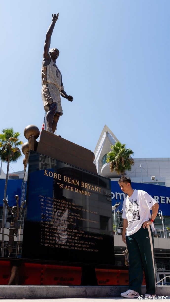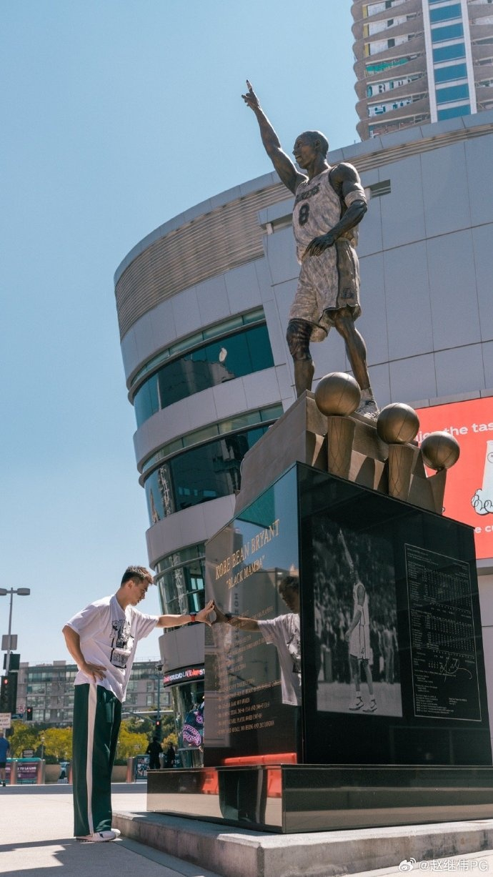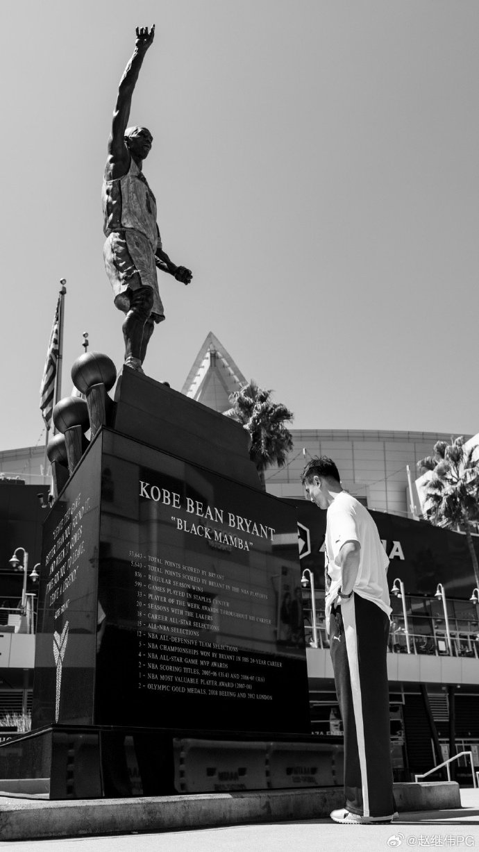 “最近…!感想最多的就是到科比雕像前。曾经有机会会见到科比本人,但是都是错过了,以为以后机会会很多,但是没想到……还是那句话,珍惜当下。”赵继伟在图片旁边写道。
